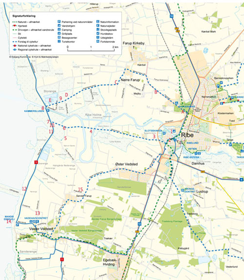Fahren Sie in Richtung Kammerschleuse. Das Ausrichten von Ribe-Fluss, der Bau vom Ribe Deich und der Kammerschleuse begann erst im frühen zwanzigsten Jahrhundert und hatte einen enormen Einfluss auf das Aussehen des heutigen Ribe Marsch. Das Marschland wird nicht im gleichen Maße überschwemmt, dadurch hat es sich auch für Landwirte gelohnt die Weidenflächen für mehr und intensive Landwirtschaft zu nutzen. Die Kammerschleuse reguliert das Wasser im Ribe-Fluss. Diese Gegend ist ein beliebtes Erholungsgebiet für Ribes Einwohner, einige haben sogar ein kleines Freizeithaus oder ein Boot am Fluss liegen. Diese Häuser liegen auf einem Gründe der nicht für den Privatersitz erwerbt, sondern nur von der Kommune gemietet werden kann. Gehen Sie auf die Fußgängerbrücke über der Kammerschleuse, von dort hat man einen sehr guten Überblick. Beachten Sie den großen und breiten Kanal, der in einem letzten großen Versuch damals ausgegraben wurde, um den wichtigen Seeweg von der Nordsee bis In Ribe zu halten und damit der Stadt ihre Bedeutung als Hafenstadt an der Westküste zurückgewinnen konnte. Bei diesem letzten Versuch gelang, wie wir wissen leider nicht, denn Esbjerg übernahm Ribes Position als die wichtigste Hafenstadt an der Westküste.